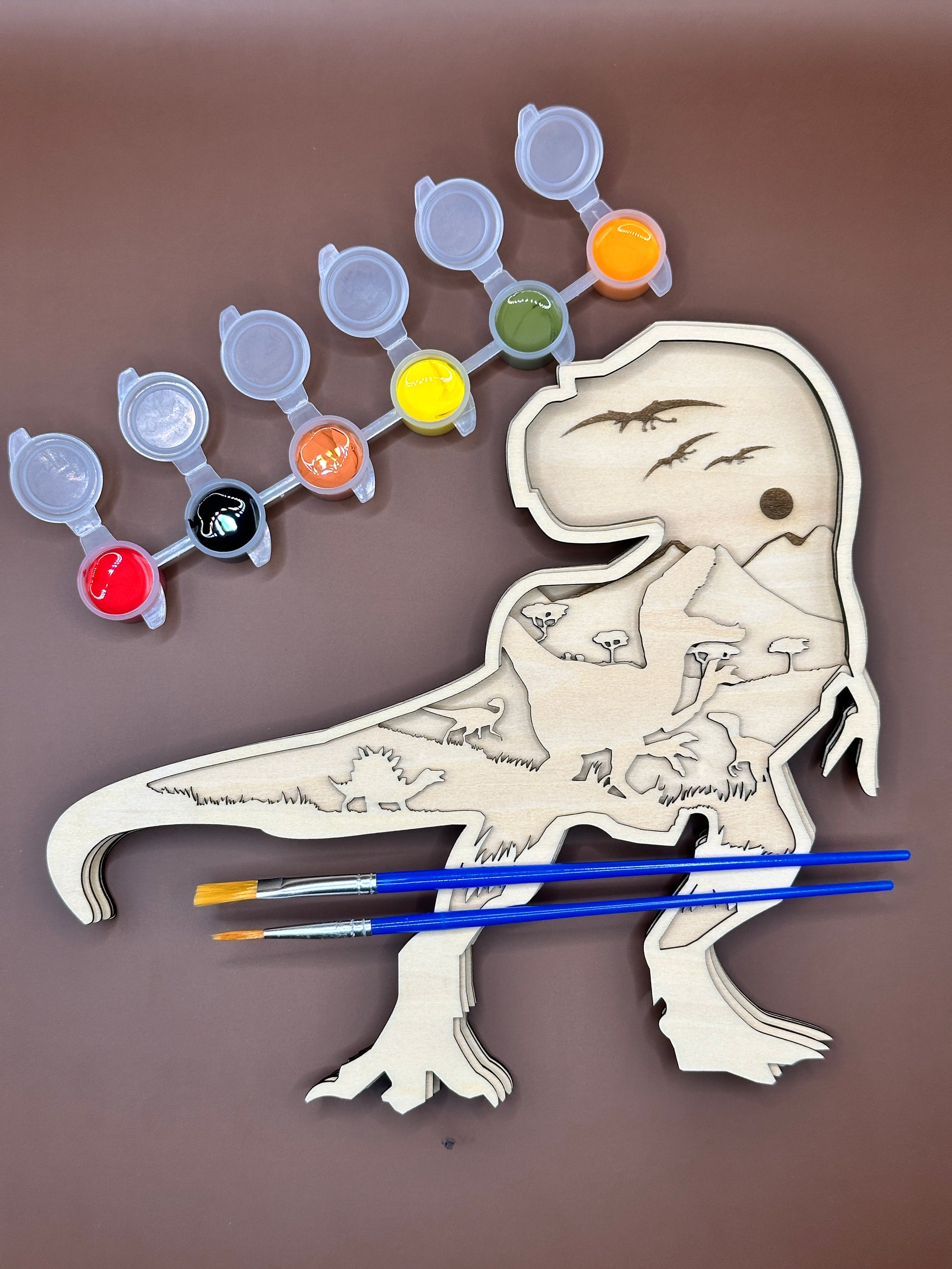 Six layer dinosaur art including six relevant paint colours, wood glue and two paint brushes.