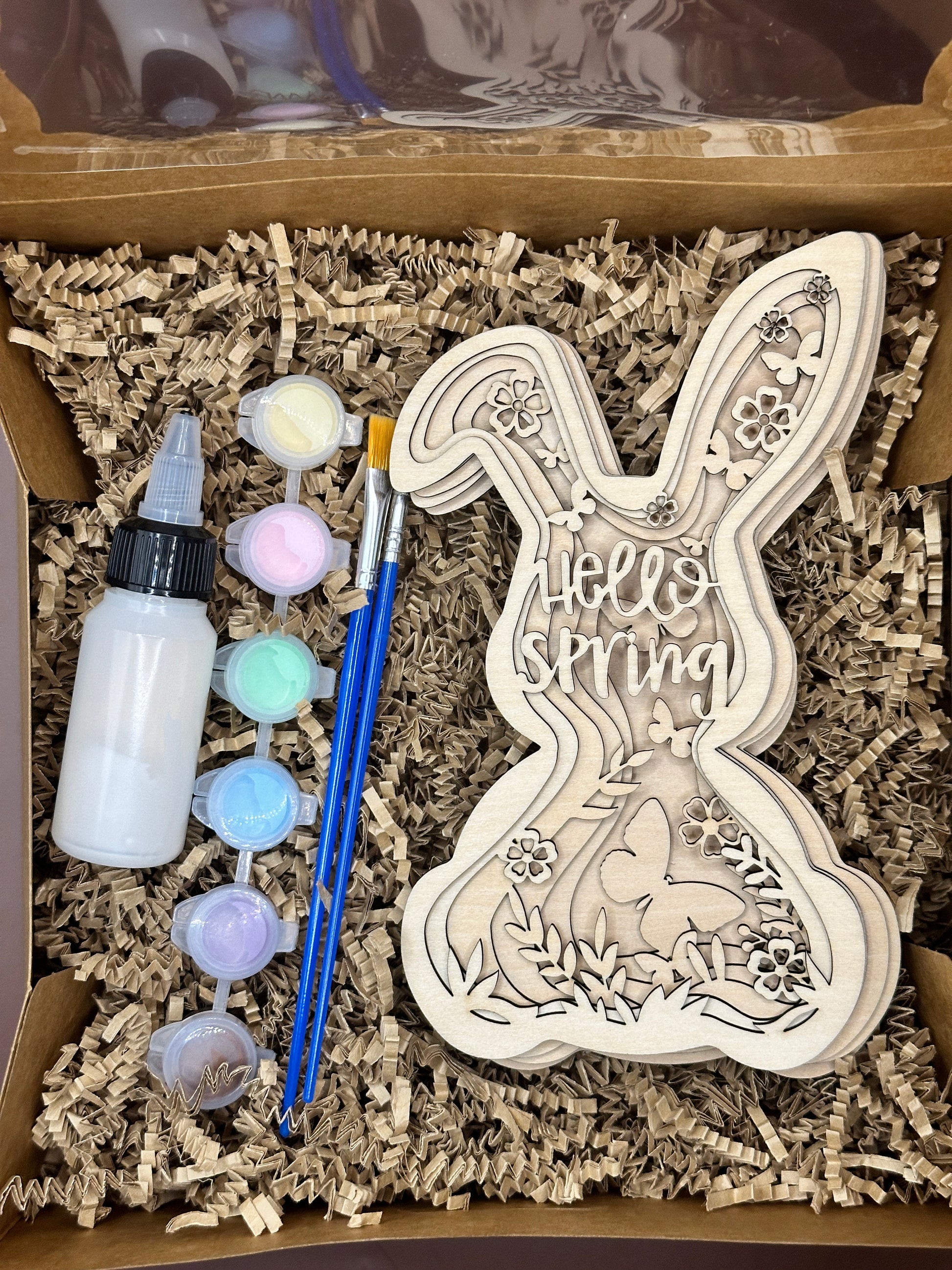 Six wooden layers, each adding its own detail to the final piece. Included in the set are six spring time colours, two paint brushes and wood glue.