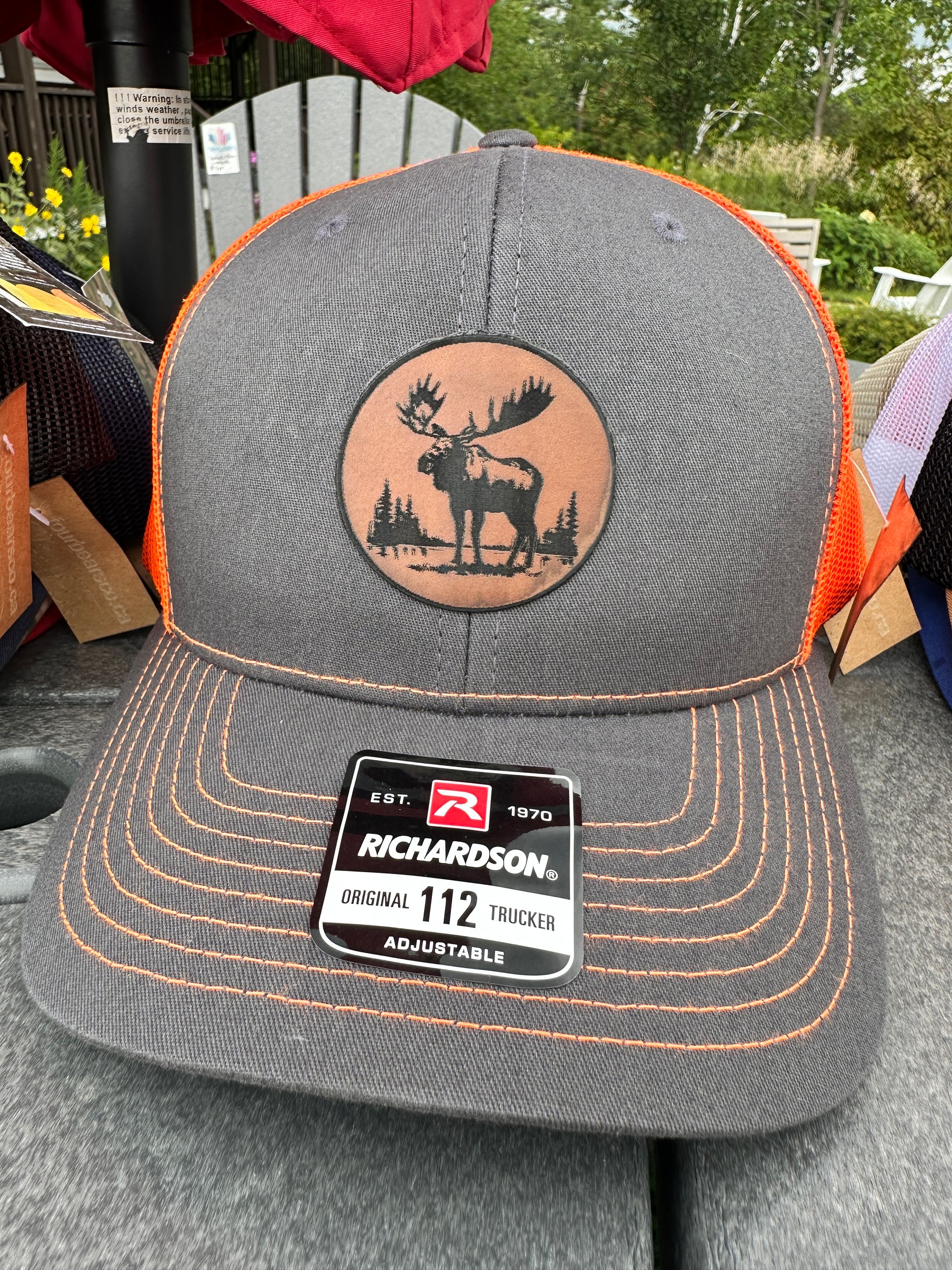 Grey/Neon Orange trucker hat with rawhide patch