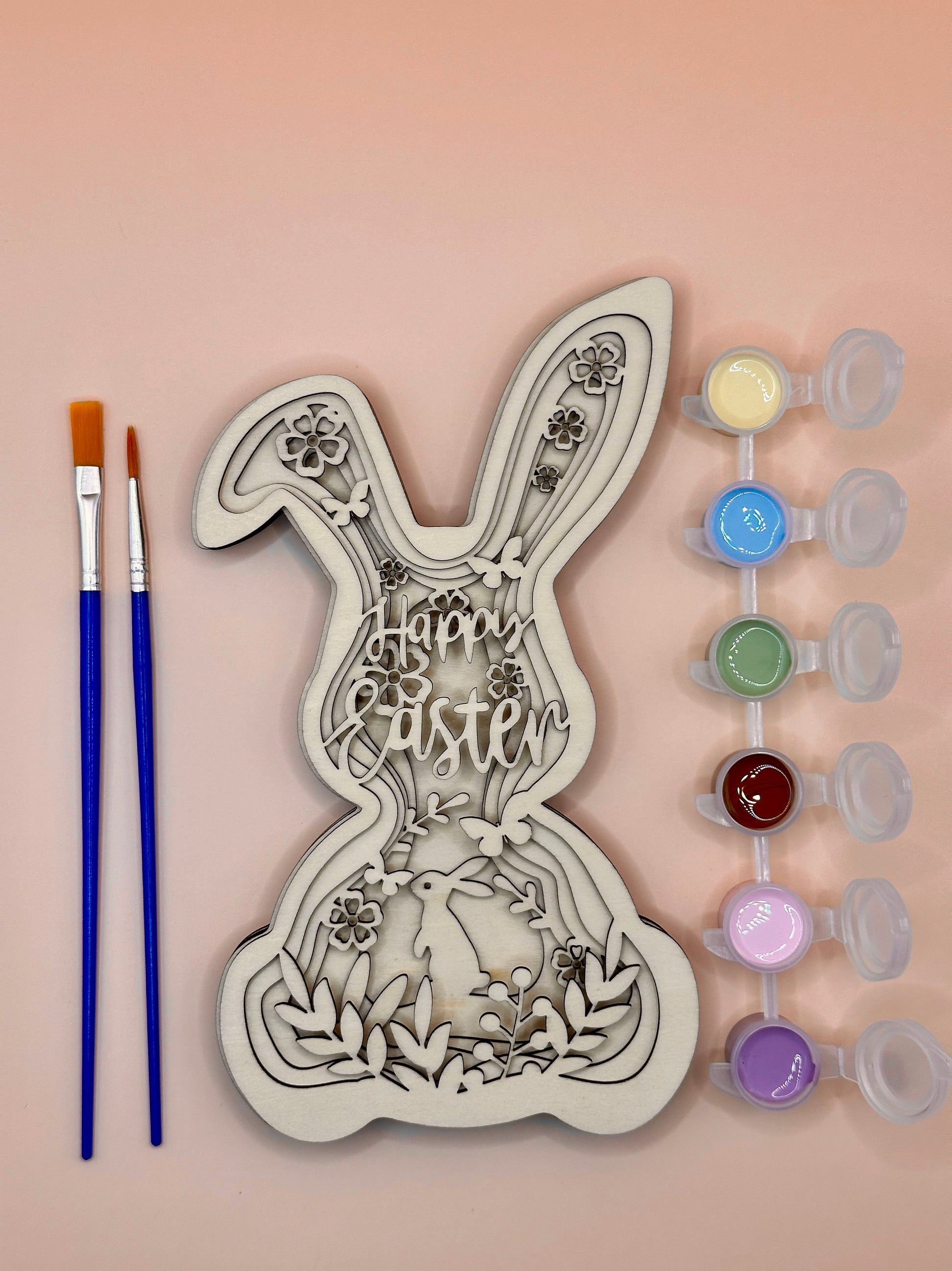 Six wooden layers, each adding its own detail to the final piece. Included in the set are six spring time colours, two paint brushes and wood glue.